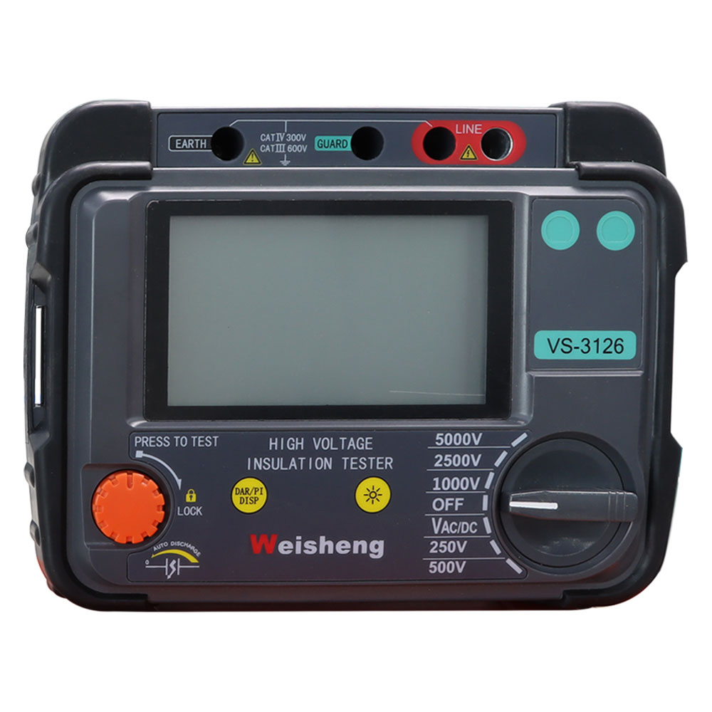 VS-3127 VS-3127Penguji Penebat Voltan Tinggimenawarkan keupayaan untuk melakukan pengukuran rintangan penebat yang tepat sehingga voltan ujian 15 kV dengan rintangan maksimum 30 TΩ. Ketepatan ukuran rintangan ialah ± 5 % daripada 1 MΩ hingga 3 TΩ! Untuk syarikat utiliti dan perkhidmatan, VS-3127 ialah penguji menyeluruh dengan fleksibiliti dan keupayaan kalis masa hadapannya. Weshine VS-3127 direka untuk berfungsi di mana sahaja anda bekerja. Voltan terkadar output maksimum mencapai 7 gear (250V, 500V, 1KV, 2.5KV, 5KV, 10KV, 15KV). Arus litar pintas maks 7mA Ujian rintangan penebat (IR), ujian indeks polarisasi(PI), ujian nisbah penyerapan dielektrik(DAR). Mod ujian tanjakan (RAMP), mod ujian rintangan ditapis (FR). *Ujian Kapasitans (Kap.). Fungsi monitor voltan, secara automatik memantau voltan hidup yang diukur
